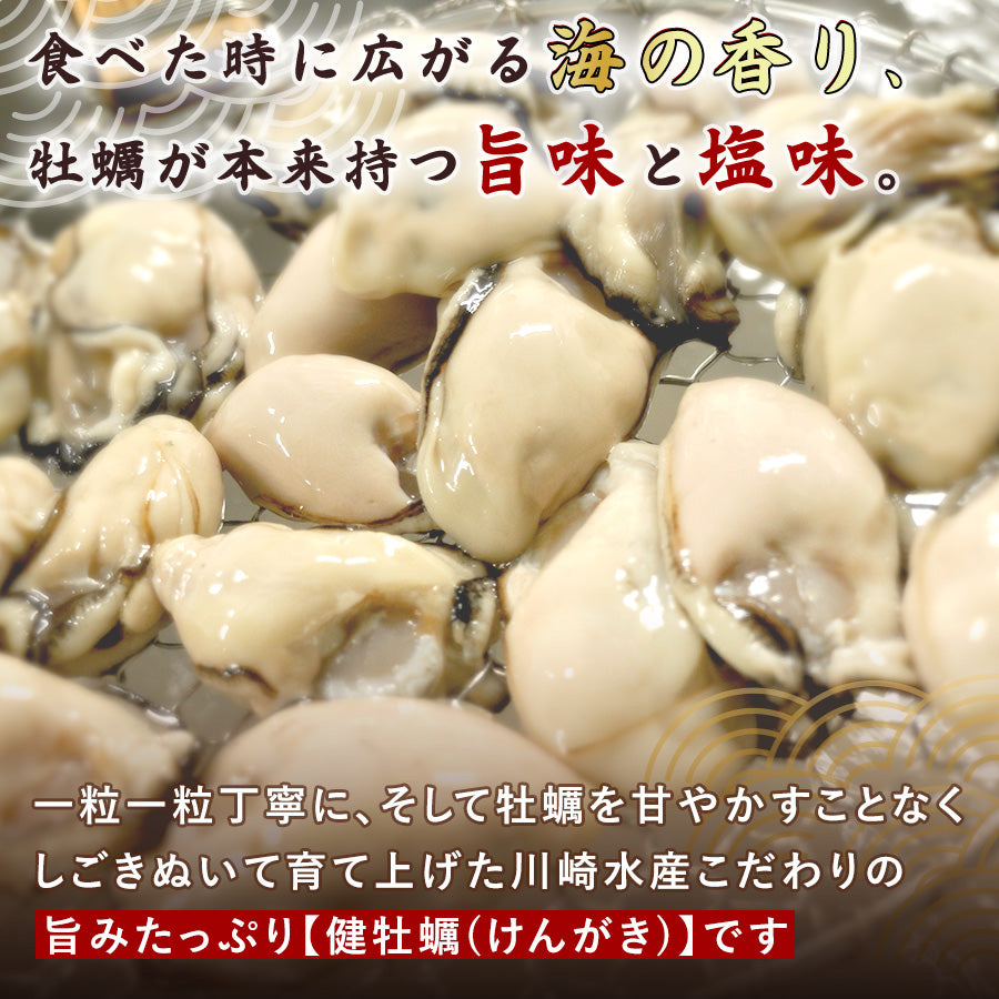 一粒一粒丁寧に、そして牡蠣を甘やかすことなくしごきぬいて育て上げた川崎水産こだわりの“旨みたっぷり【健牡蠣(けんかき)】”です。
